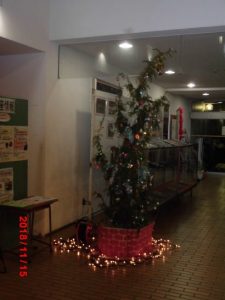早々と公民館のロビーには、クリスマスツリーがお目見え。ジングルベルこそ聞こえないが、いかにも早すぎる。