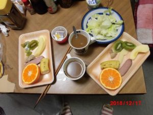 これが我が家の朝の食事。六枚切りの食パンに、コーヒー、ミカン・キュウイ半分。リンゴ1/4個、ハムに燻製一切れ、鶏のから揚げ一個。バナナ半分。納豆・ヨーグルト1/2にレタス少々。私が毎朝支度をして、家内は食べる人。といっても、片づけは家内がしてくれる。夕食の後はウオーキング。万歩計は10.821