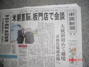 昨日の朝刊一面には、両首脳が、お互いに国境線を超えたと、大々的に報じているが、トランプの思いつきに、金正恩が乗っている。どちらもどちらである。