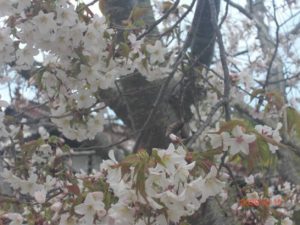 春霞ではっきりしないが、いつものことながら、瀬戸内海の多島美を堪能させてくれる。遅咲きの桜か、今は満開であった。
