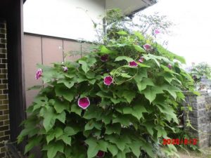 今を盛りに朝顔が咲いてくれる。路地に植え、植木に、自由に登らせたら、植木を隠して我が物顔にはびこって、その分花もたくさん咲いてくれた。もうしばらくは楽しませてくれそうだ。
