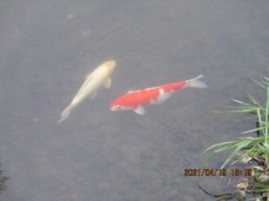 桜の後の花が次々咲いて、散歩を楽しませてくれるが、今日は池の鯉も姿を見せてくれた。
