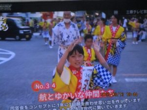 夕食は娘の孫二人と娘3人が、寿司を持って来てくれて一緒に食べた。その時の話によると、下の孫がダンス教室をやっているのが、やっさ最終美の明日、花火が始まる前の舞台で、生徒と一緒に踊るという。暑いのでテレビの実況中継を見ることにする。