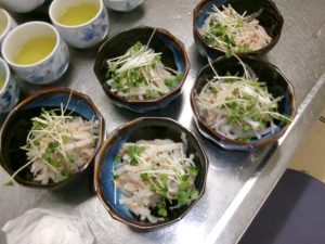 大根サラダ。大根を千切りにしたものと、ツナ缶を混ぜ、あらびき黒コショウで味付け、カイワレをトッピングしていただく。歯が悪いので大根が硬かった。大根は、なますの時のように付きおろしした方が、食べやすいと思う。
