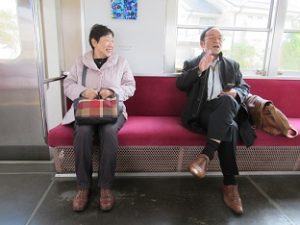 遠路来ていただいた電車の中の絵扇サン   尾藤川柳氏の短冊の書き方を佐瀬貴子さん