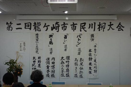 12月17日龍ヶ崎市役所別棟2階にて第2回龍ヶ崎市民川柳大会を開催文化協会長さんもおいでいただき40名の会議室はいっぱいになりました。兎に角年の瀬に来てあんなに笑ったことはないというほど和やかに打ち解けて楽しい会にしていただきました。 本荘静光氏の講演「ユーモアの中の川柳」が楽しかった。ひょうひょう...
