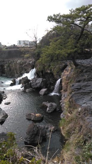 鮎壺の滝の岩盤はおよそ1万年前に流れて来た溶岩流です。