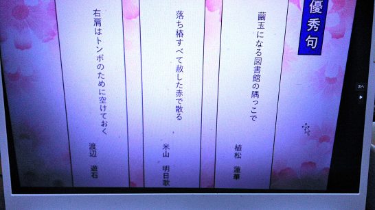 昨日はお疲れさんでした、川柳さくさ の快進撃目を見張るかつやくでした、これほどの「力」を見せられると・・なんだか「すがすがしく」感じる・・負け惜しみでは無い気持ちです、次回の大会は上位入賞者(川柳さくら)は-ハンデを付ける事を「協会決定」をお願いします。でも昼食も美味しくとても良い大会でした。たまには「甲州」「駿河」で一献かたむけたいね~。