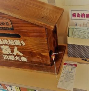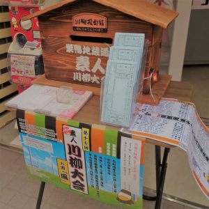 商店街各所に置かれている投句箱の一例。今年のお題は「風」です。