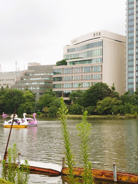 会場の上野東天紅(中央のビル)を不忍池から眺めて。