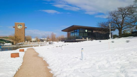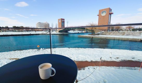 富山市役所展望塔より(山が見たくて同日朝夕と2回行きました) > > オシャレなカフェ(STARBUCKS富山環水公園店)の全景 > > 凍えながらオシャカフェが似合う人ゴッコ