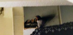 (写真上は千里中央・せんちゅうパル2階の眼鏡屋さんの軒先(?)で先週撮影。巣が壊れてしまったのか、桟のような部分に雛が並んでいて、落ちないようにか日傘が逆さにかけられていました。お母さんツバメが何度も何度も子供たちにごはんを運んでいるところの撮影にやっと成功した一枚です。下はやはり同日、せんちゅうぱるの1階エスカレーター近くにある(別の)ツバメの巣で、仲良く並びながらお母さんを待っている赤ちゃんツバメたち。非常事態宣言下の日々ではありますが、こんな可愛らしい姿にしばし癒された時間でした。)