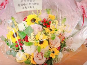 2023年4月22日は川柳文学コロキュウム終刊記念の集いの開催日。心配していたお天気も暑くもなく寒くもなく、雨の心配もない爽やかな一日で、これはきっと神さまがちゃんと見て下さっていたのでしょう。急な呼びかけにもかかわらず参加表明して下さった会員および誌友は私を除いて32名。地元の大阪、兵庫、奈良、京都の他、青森、宮城、福島、栃木、茨城、千葉、静岡、富山、石川、福井、広島、鳥取、島根。宮崎等、遠方からも大阪・梅田にある会場・がんこ梅田本店の宴会場までかけつけて下さいました。中には私も初めてお目にかかる方が4名おられて緊張した時間も。それぞれの自己紹介、飲んだり食べたり歓談したり、後半にはミニ句会(事前投句の自由吟・ますみ選)等等3時間という制限の中でうまくこなせるか心配していましたがちょうどいい感じで終了までこぎつけ、最後に店員さんにスマホ撮影で手伝ってもらったのが上の集合写真です。かわいいお花もたくさん頂戴しました。
