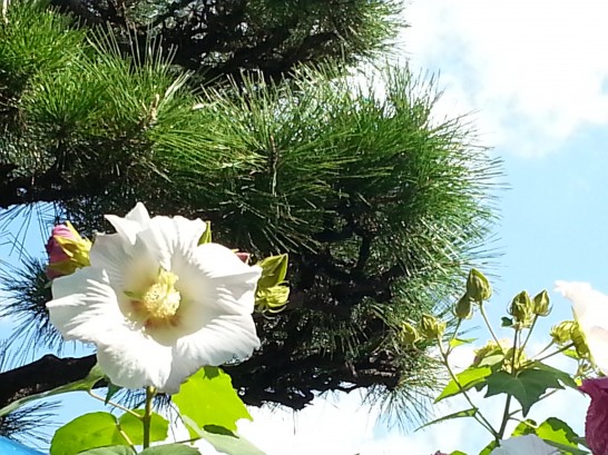 (やっと咲き始めた昨日の朝撮影の芙蓉。花は他にピンクもあるのですが、 今年は白色のほうが多いようです)