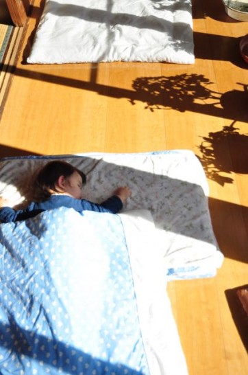 ところで、写真は縁側に取り込んだ布団の上で、子どもが寝てしまったんですね。
