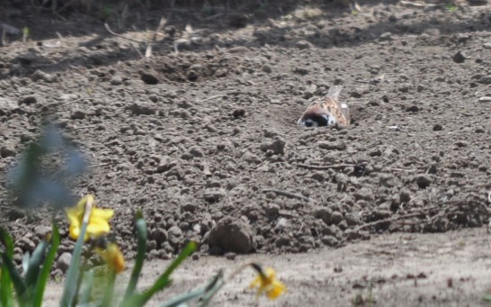 恵さん おはようございます。勤労意欲、満々。まめですね。お楽しみの庭先で「ジャガイモくん」と「春菊ちゃん」とのホットな三角関係ですか。スズメたちも入れて下さい。スズメは砂浴びが大好きです。水浴びはよく見ますが、砂浴びで、大事な羽に汚れがあったり、寄生虫がいると、命取りになるので、念入りに手入れをするのです。格好の場所を提供されましたね。いのちの洗濯、スズメたちは喜んでいます。そのクレーターは、そのままにしておきますと、また、そこへやって来ます。とっぷりと全身を沈めて、目を閉じて砂を飛ばします。今朝は、すすめたちと一緒に、砂浴びをさせていただきました。ありがとうございます。