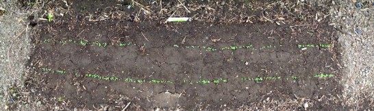 実は、正規の畑に蒔く前に、一つだけ別の場所に少し早く蒔いたジャガイモがあるのですが、そちらはスゴく元気な緑色の葉っぱが出てきました。と思ったらあっという間にもう十センチくらいになりました。こちらは種芋ではなくて食用のジャガイモですが、引き出しの中で勝手に自分で芽出しをしていたのです。地上に出てきた芽は四つ、どれも元気なので、どう間引いたらいいのか悩んでいます。丈夫そうな茎を切るのは勇気が要りますね。