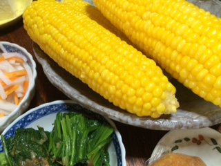 それは、私の好きなドライブの延長ではなかなかに到達は困難と思われるほどの遠方から届けられました。盛夏を彩る食べ物の中にあって、子供から大人まである種の魅力(きっとそれは楽しさ!)を感じるとすれば、それは西瓜とも違うしもちろん秋近くになってからの果物とも違うものでしょう。朝取りの、それも畑が近いのならば、台所でお湯を沸かしておいてからというくらい新鮮さを一番に考えるものらしい食べ物です。甘さが消えていくからというのは、人間ならば前向きな成長だろうけれどこれはそうはいきません。