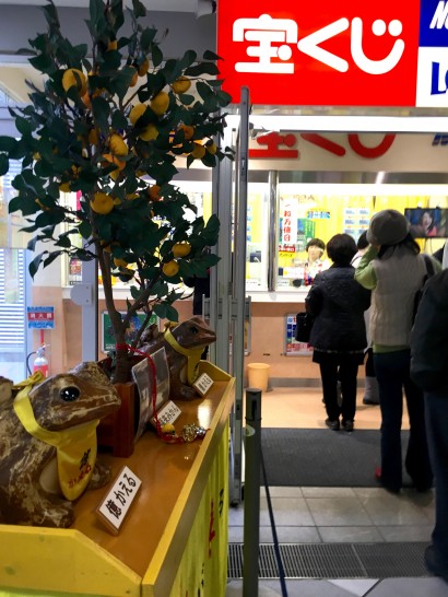 本当だ!宝くじの看板の色とそっくりで縁起がいいですね。もしもの時にはどこの銀行に預けるか、使い道をどうするか‥‥家族会議白熱中です。