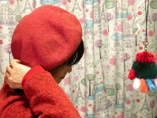 一足早いプレゼント、お気に入りの真っ赤なベレー帽はきっとお似合いでしょう。