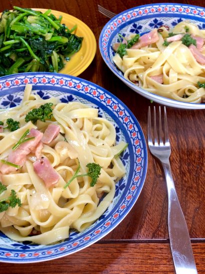 お腹の空いている時間には食べ物の写真は刺激的ですね。イタリアンのシェフならばお味の方も最高でしょう。きしめんかひもかわうどんかという見た目ですが、れっきとした生パスタ。時々ランチメニューに登場です。ベーコンと畑直送のほうれん草を使いました。茹で汁をフライパンにどれだけ入れるかの加減が難しいですね。チーズとタバスコもたっぷりかけて食べるのが大好きです。