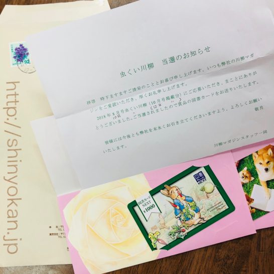 公募先もいろいろあるようですが、すごく太っ腹なところもあると思えば、そんなに多い人数じゃないのに末席にはかわいい額のクオカードが届いたりします。まあ入選すること自体がありがたいので文句を言えばバチが当たりますね。やはり賞品がビッグだと欲を出して参加しますが、もちろんかすりもしません。笑