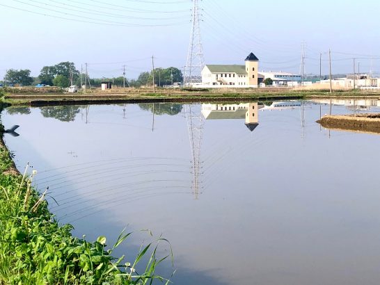 周りの田んぼに水が入って、見慣れた風景も少し変わってきました。風のある日に騒ぐ水面も静かな水面もそれぞれに楽しいですね。何よりも風が涼しくなります。水の上を通ってくるので天然のクーラーになるのですね。こちらに来て実感できた発見でした。