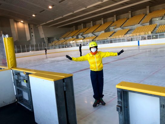 スケーターズワルツに乗ってすってんころりんですか?子供は転んでも大丈夫ですが、大人は、、スケートで救急車もありえますからクワバラクワバラ。ヘルメットが年相応にお似合いです。コロナのせいでしょうね、立派なリンクがガラガラ。昔は自分の靴持っていましたけど今でも滑れるでしょうか。