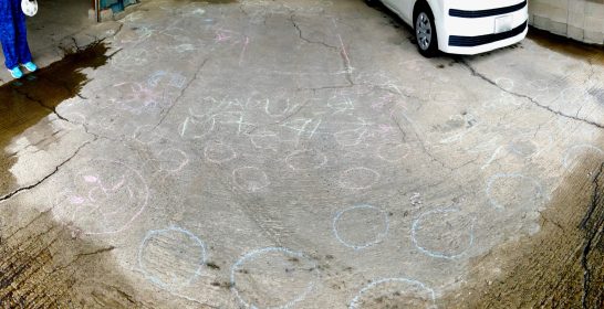 カラフルな太いチョークはいたずら書き用なのかしら。今は教室でチョークなんて使わないのかな?自由に書いていいよと言われるとかえって難しそう。