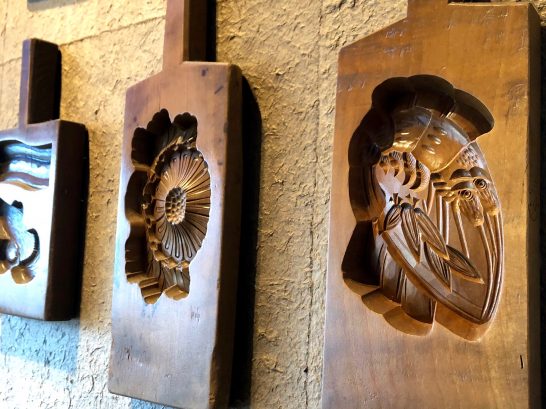 壁に並んでいたのは和菓子屋さんで使う珍しい大きな型でした。お店の由来などもゆっくり尋ねてみたかったな。でもデザートは薄切り!?シフォンケーキ。和菓子もよかったですね。
