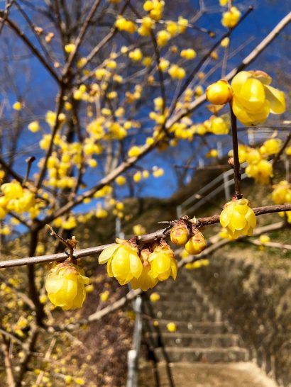 お城といえば個人的には福山城ですが、小さな城跡もなかなか風情のあるものです。斜めになった階段に心もとない手すりですから蝋梅を楽しむのも努力しないと落ちてしまいそう。足元が危ういのは人間としても同じです(涙)。