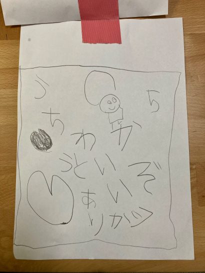 さて、下の2枚は?上はボンサイ下はテンサイ?桜の若木の盆栽にはちょっと鉢が大き過ぎじゃありませんか。これから幼稚園ということは3歳?4歳?このくらい字が書けても早過ぎるなんてことはないんでしょう。「く」が反対なのを直さないおおらかな教育をお願いしますね。