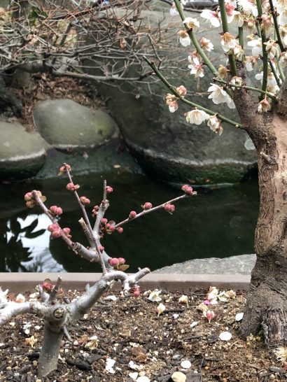 満開の梅の下でやっぱり春を待っている木瓜は