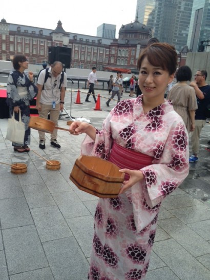 また、別の日は東京・丸の内での打ち水イベントに参加しました。東京駅をバックにパシャパシャ