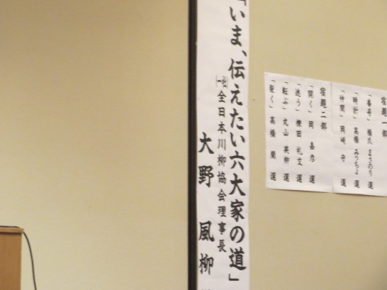 参加者は159名、この中道外の方が3名含まれる。道外参加者は、新潟の若林柳一さん、青森の渋谷伯龍さん、そして高知の常石麗子さんの3名であった。宿題一部の投句者は293名(中道外投句者93名)であった。記念講演は全日本川柳協会の大野風柳理事長にお願いした。「いま、伝えたい六大家の道」と題して話された講演を参加者は熱心に拝聴した。