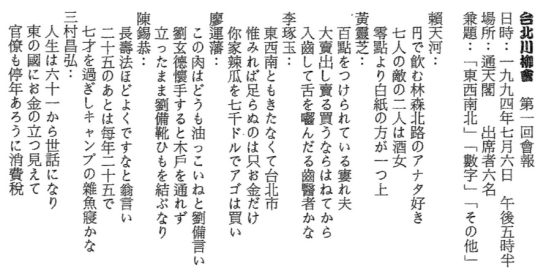 賴天河先生には、残念ながらお目にかかれませんでした。台湾川柳会の第二代会長からはご交誼を頂戴しております。 小生も来春、お邪魔させていただきます。今度は、一週間以上(お金の続く限り、笑)滞在するつもりです。よろしくお願いします。