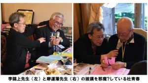 懇親会十七時よりスタート。場所は国王大飯店から徒歩五分のオークラプレステージ台北。懇親会は三村昌弘先生の乾杯の音頭で開会、普段日本でも名前しかわからない柳豪たちが、まさか台湾での再会ですっかり打ち解けた。当会最高齢の高薫様は「台湾たのしや」の歌詞を全員に配り、みんなで合唱した。そして昭和二年生まれの李錦上先生は日本の昔の歌をアカペラで披露してくれた。締めくくりは三十周年の再会を誓い、杜青春の三本締めで閉会した。