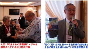 披講は、日本側、北川拓治先生、江畑哲男先生、台湾側、李錦上先生、廖運藩先生。披講に先立ち、北川先生は当会九〇歳以上の会員にメダル?!を、また来会者全員に記念タオルを贈呈した。江畑先生は「近くて近い台湾と日本~日台川柳交流句集」を手に、廖先生が執筆した初代頼天河会長の話を紹介し、日本語の造詣の深さに堪能されたと語った。李先生と廖先生は九〇代ながら歯切れの良さで、てきぱきと熟された。