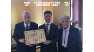 去る9/11、日本台湾交流協会台北事務所(大使館に相当)の大使公邸で表題の表彰式が行われました。(7/17のブログご参照)