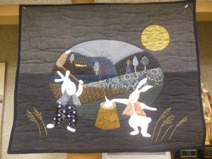 会場に飾ったタペストリー。月見の雰囲気は出る。帰りに空を見ると美しい半月だった。