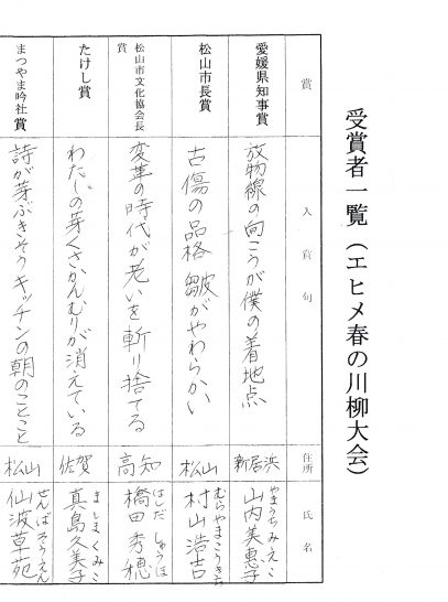これは一昨日行われたエヒメ春の川柳大会の入賞作品。山内美惠子さん、村山浩吉さん、橋田秀穂さん、真島久美子さん、仙波草苑さんおめでとうございます。