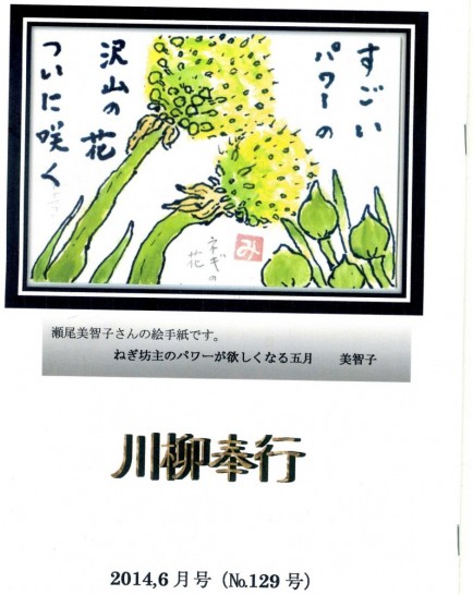 先日届いた「川柳奉行」の表紙は「ねぎ坊主」。絵と句は会員の美智子さん。上手!!!。ねぎといえば、私はねぎの白いところが大嫌い。細かく刻めば大丈夫だが、すき焼きの中に入っている大きなねぎのぬるっとした感触は考えただけでぞっとする。竜宮に居た時、看護師さんに「世の中で点滴とねぎの白いところ程、嫌いなものは無い」と言って笑われた。