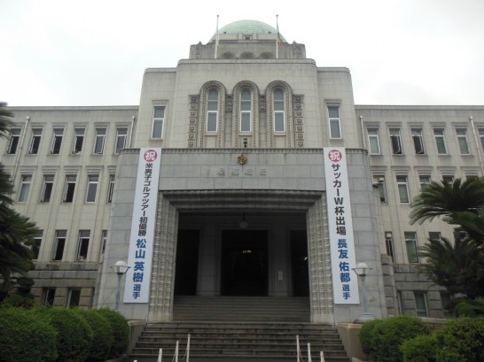 写真左は県庁に吊られている、松山英樹が先ごろアメリカゴルフツアーで初優勝したことを記念した懸垂幕。