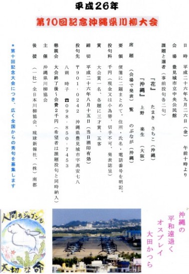 「第10回記念沖縄県川柳大会」を早速ご案内いただきありがとうございます。