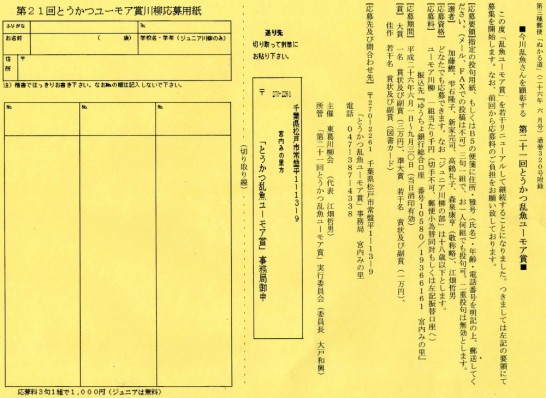 とうかつ乱魚ユーモア賞川柳応募用紙が送られてきた。締切は9月30日、投句料は3句で1000円、投句用紙はB5の便箋で可、皆さんふるってご応募をお願いいたします。