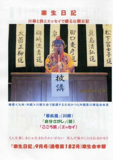 過日届いた楽勝日記の表紙にに沖縄の大田かつらさんの写真が載っていた。大田かつらさんはじめ沖縄の方には川柳まつやま吟社はお世話になっている。8月15日締め切りの沖縄大会は出来る限りの応援をしたい。皆さんよろしくお願いいたします。投句要領の詳細は完司さんのブログ7月24日を見ていただきたい。