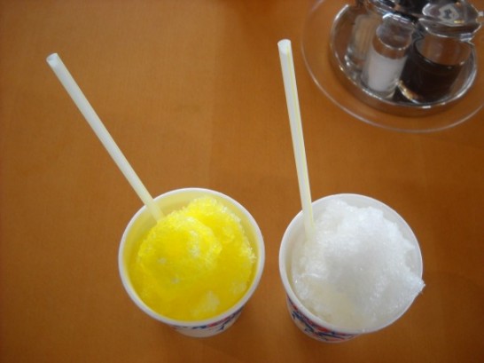 昼食後早目に帰途についたが結果的にはそれが大正解だった。途中道の駅「みま」に立ち寄って、かき氷を食べる。庭には大きな石の魚のオブジェが置かれていた。道の駅を出て、いざ松山へ向けて快適に運転を続けていると、道路標識に「事故のため松山道の大洲・伊予間が通行止め」とのこと。なに!!!!!。するとカーナビにも該当区間に「×印」が入って、親切にも「通行止めのため新しいルートを検索します」と教えてくれる。大洲で高速を降りて、56号線を走れば30分くらいのロスかなと計算したがそれが大間違い。高速を降りる手前から大渋滞で結局1時間半位遅れて家に着いた。用事がある時は早めに行動をとること、特に今の時期は、渋滞、事故等も考慮しなければならないことを痛感した一日だった。