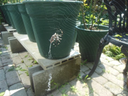 昨日玄関を出たら、玄関先においている金魚の瓶の上を蜂が飛んでいたので早速網で捕まえ、その蜂を蜘蛛の巣へ投げてやった。