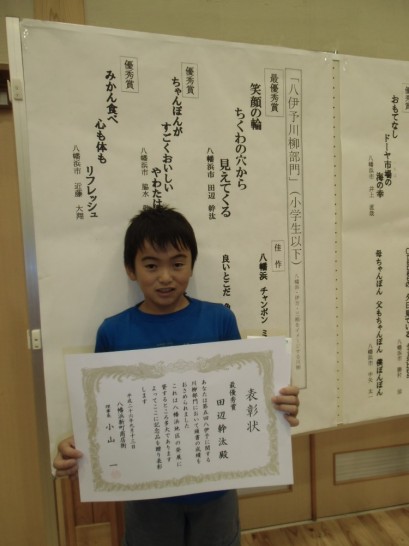 昨日孫から嬉しい電話が掛かってきた。第五回八伊予に関する川柳部門の小学生の部で最優秀に選ばれ、その表彰式に行ってきたというのだ。この制度を五年も前からやっているというのも嬉しいし、何よりも川柳の部門があるということが嬉しい、これからも継続していただきたい。そしてそれ以上に孫の句が最優秀に選ばれたことが何よりもうれしい。