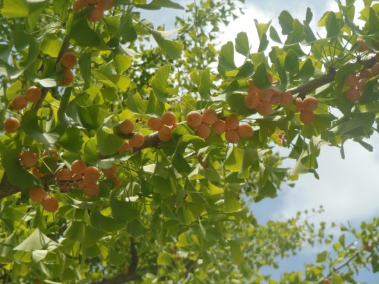 昨日の午後、好天につられてぶらっと市内に出てみた。まず堀之内のNHKに寄って、ロビー展でノラの会の慎吾さんがやっている写真展を観た。どの写真もさすがに上手で、まさに目の付け所が違う感じがした。NHKを出た後、先日のぎんなんを見てみると、相変わらず鈴生り状態で木の下にはいっぱい落ちていた。踏み潰されて種が出ているものもたくさんあったが、臭くて拾う人は誰も居なかった。もったいない気もしたが、袋も何も持ってなかったので私たちも諦めた。